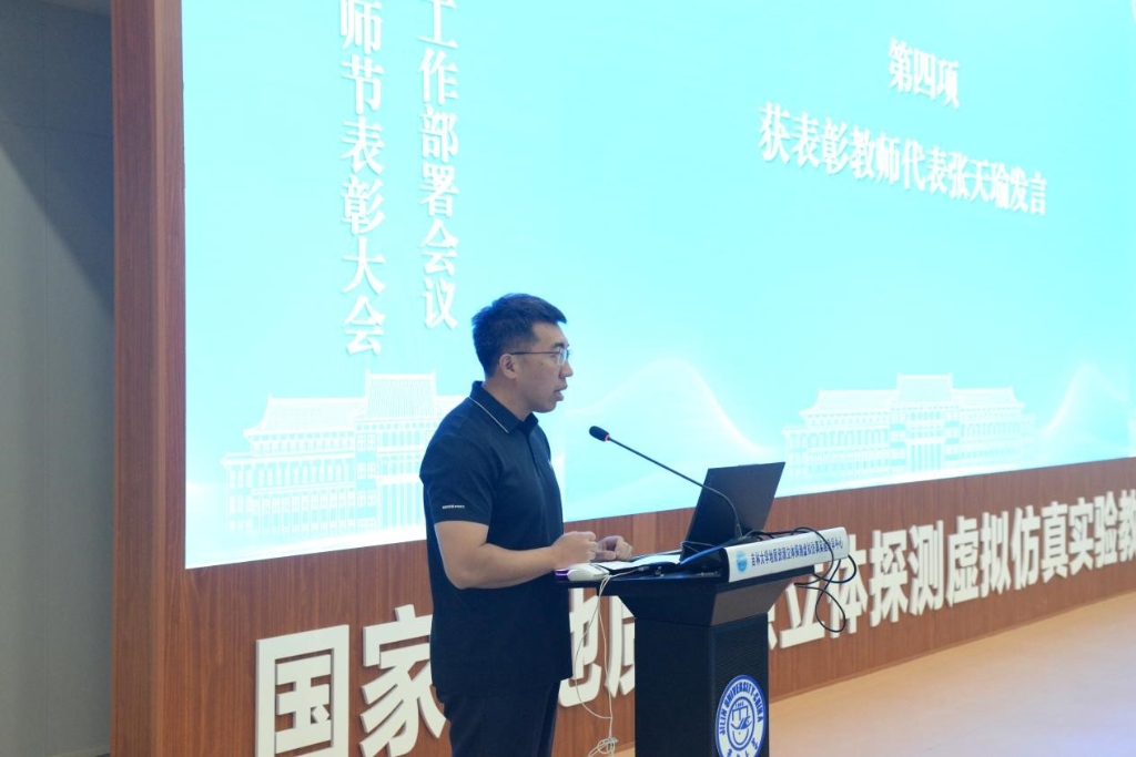 随后,电气系教师张天瑜代表获奖教职工发言。他介绍了在教学改革与创新中的实践与探索,分享了建设智能化课程体系、获得吉林省高校教师教学创新大赛一等奖的心得与体会,祝愿在线博彩教育教学工作在未来发展中不断跨越、再创辉煌。