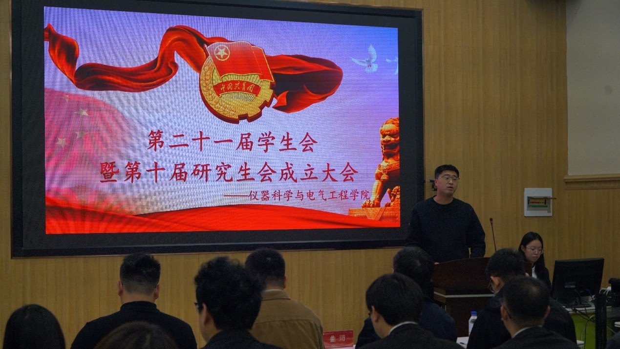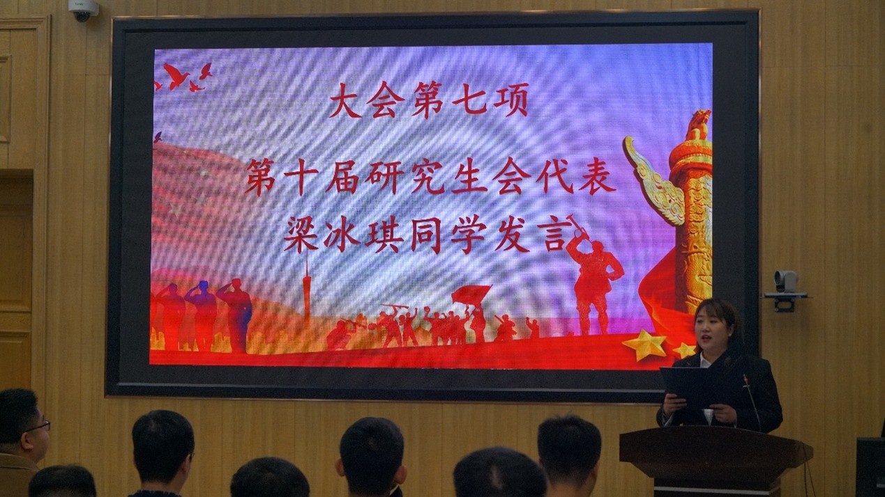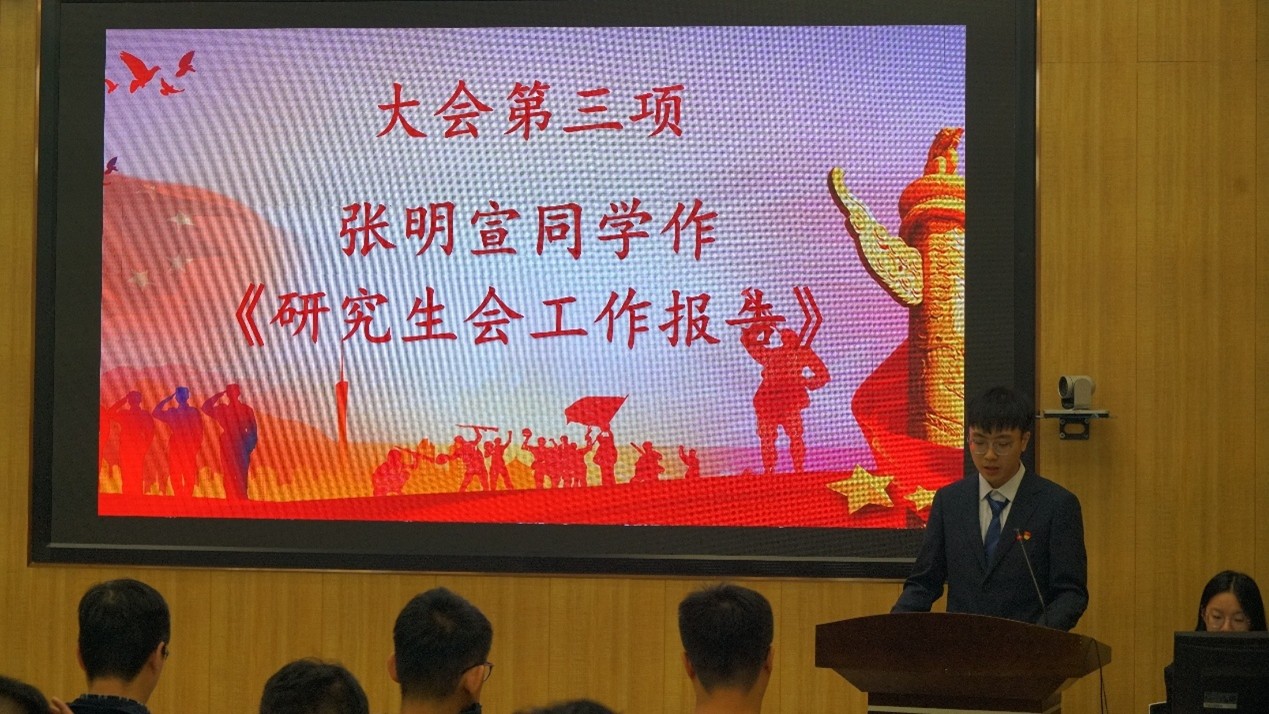 第九届研究生会执行主席张明宣作研究生会工作报告,从强化思想引领、强化学风建设、投身社会实践、丰富校园文化、强化就业服务五个方面,全面梳理了第九届研究生会的各项工作与积极影响。