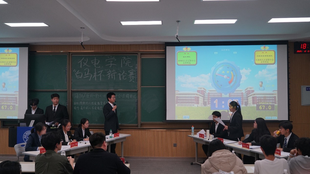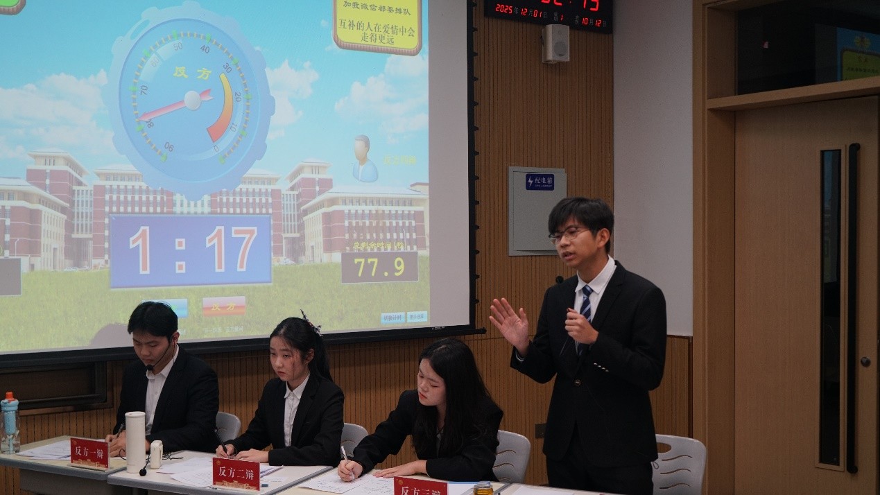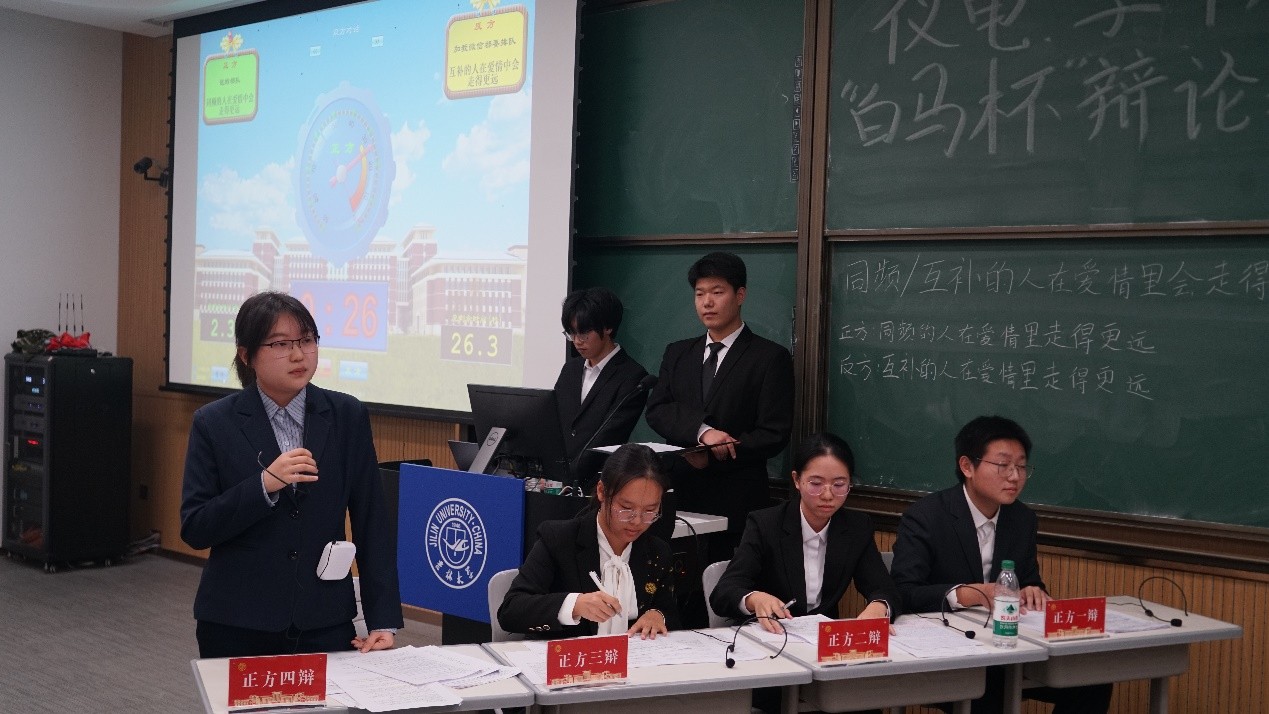 本次比赛辩题聚焦于学生们较为关注的爱情主题。正反方围绕“同频的人还是互补的人会在爱情里会走的更远”展开激烈讨论。